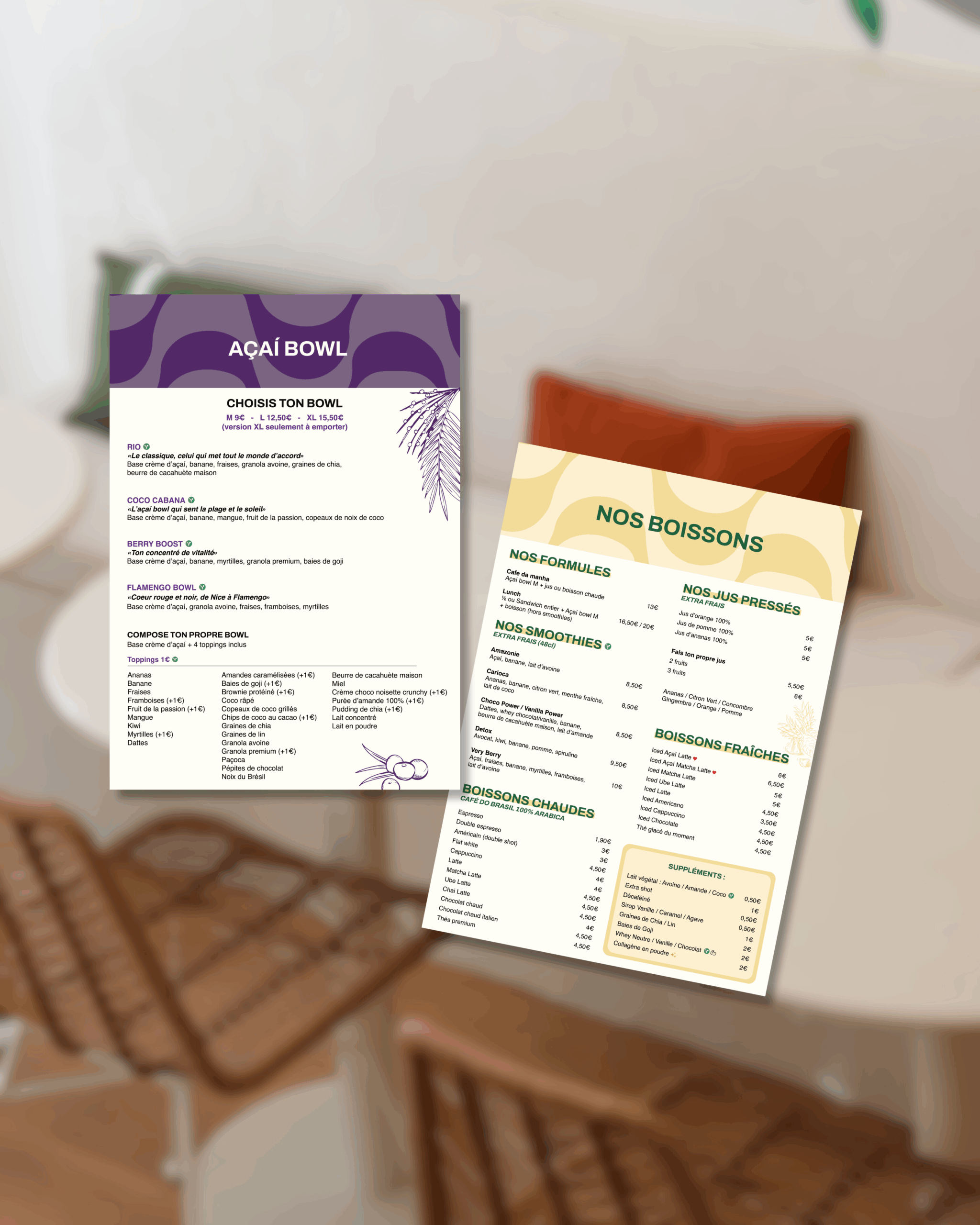 • Une typographie sur-mesure, fluide et naturelle, rappelant la texture de l’açaí et l’esprit libre du voyage.